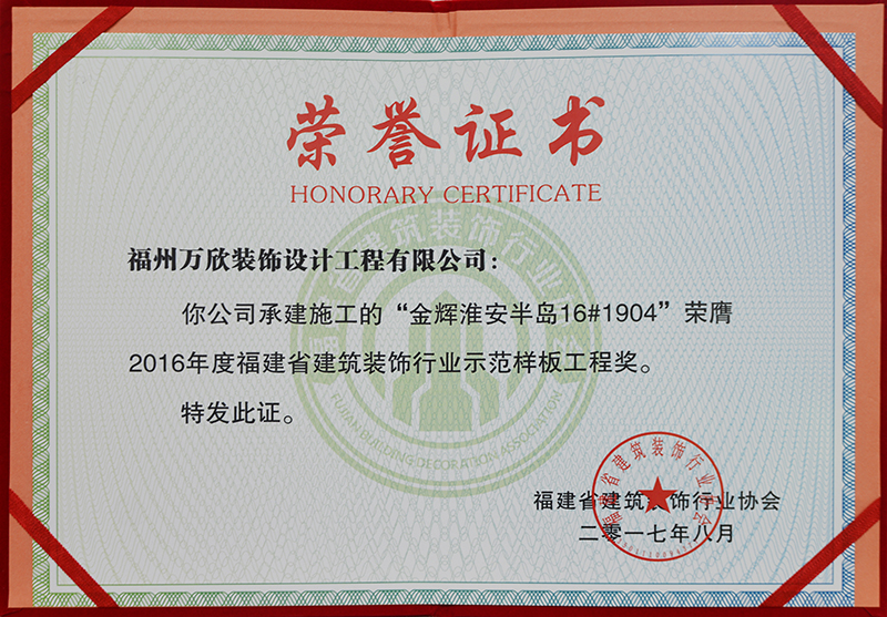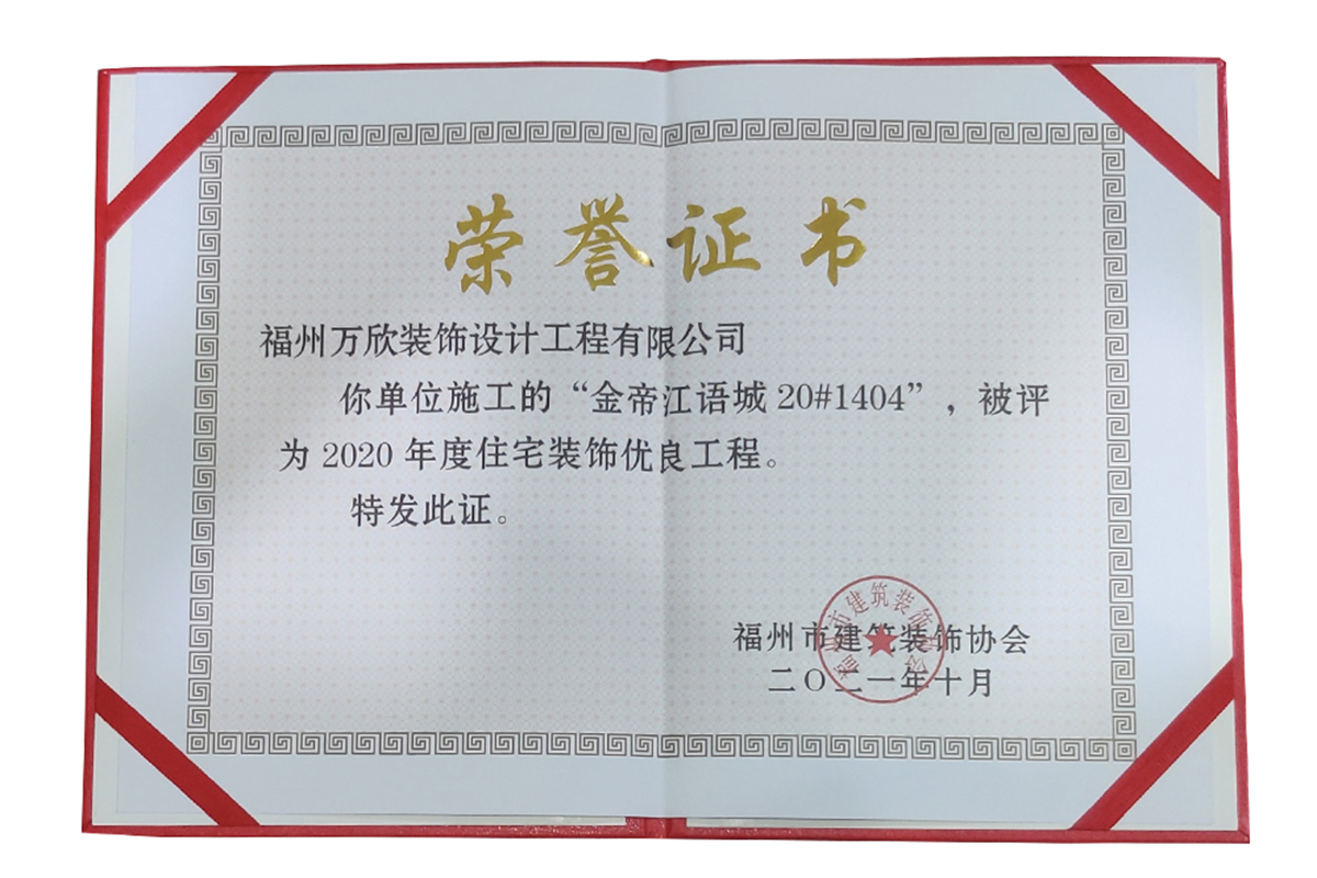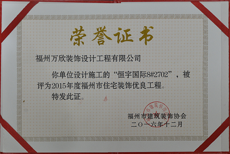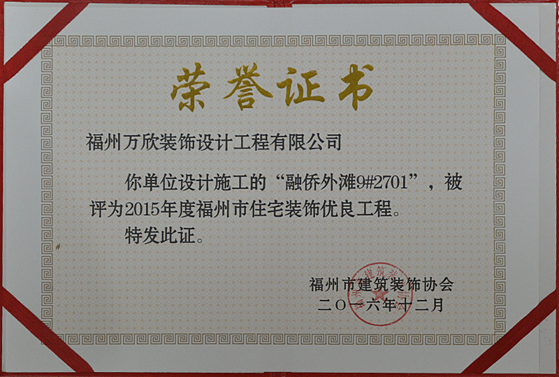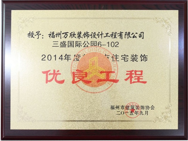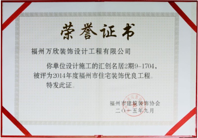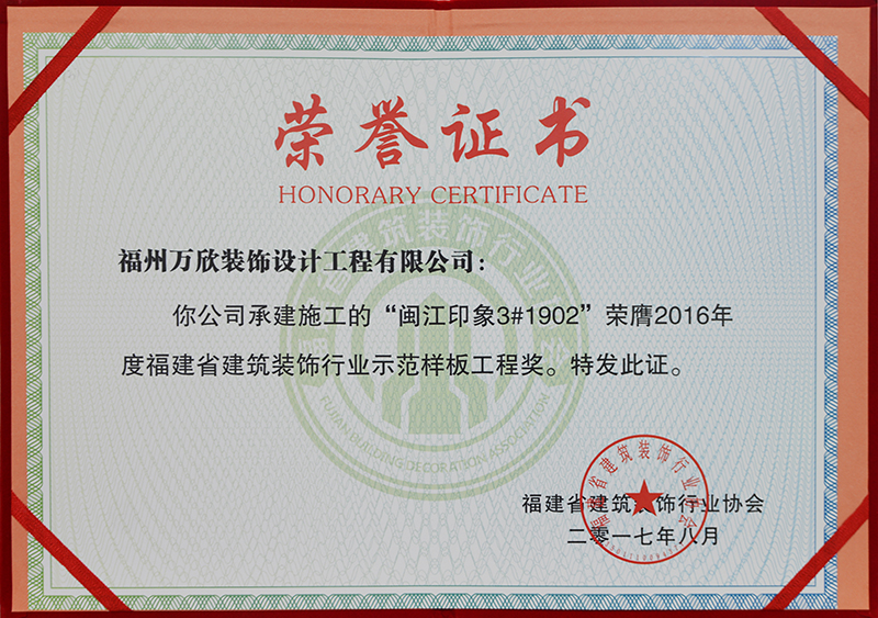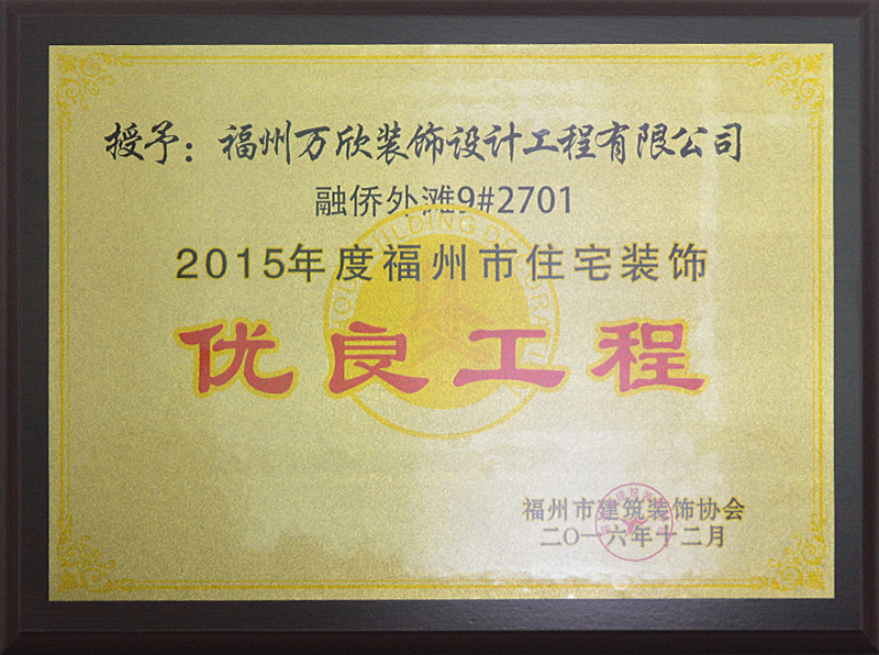 - >萬欣裝飾“閩江印象3#1902”被福州市裝協(xié)評選為優(yōu)良工程