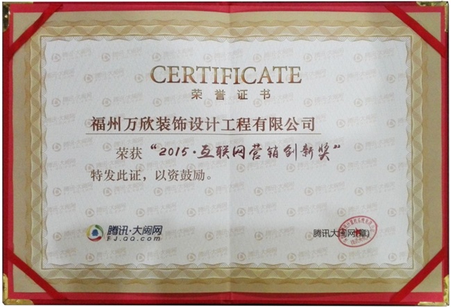 - >騰訊大閩網(wǎng)授予萬欣裝飾"2015·互聯(lián)網(wǎng)營銷創(chuàng)新獎"