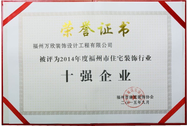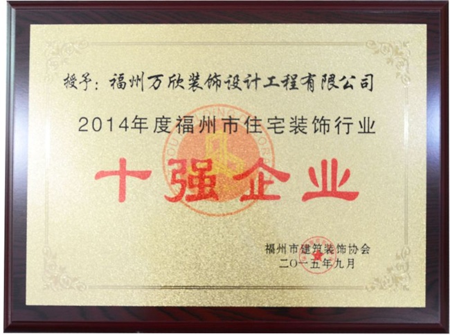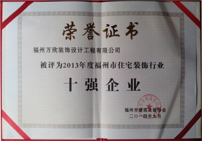 - >福州市建筑裝飾協(xié)會授予萬欣裝飾2014年度福州市住宅裝飾行業(yè)十強(qiáng)企業(yè)