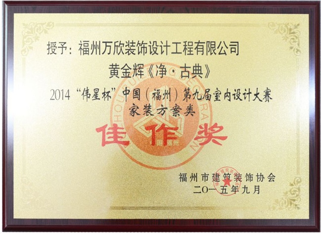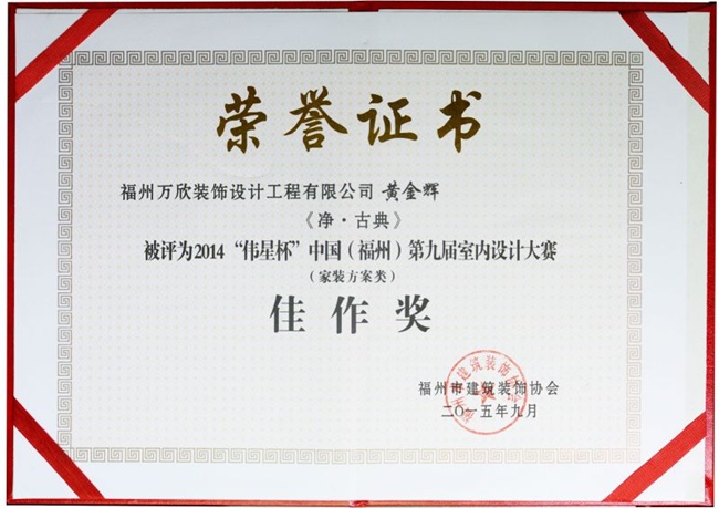 - >萬欣裝飾作品《靜·古典》被評為中國(福州)第九屆室內(nèi)設(shè)計大賽(家裝方案類)佳作獎