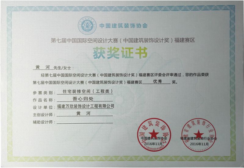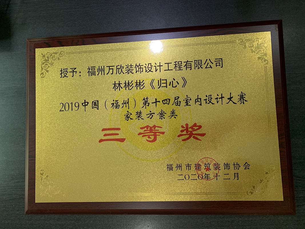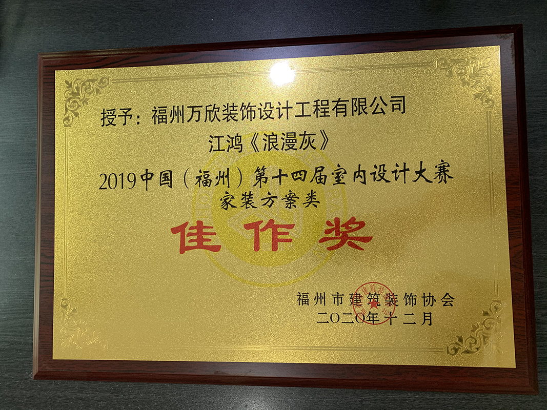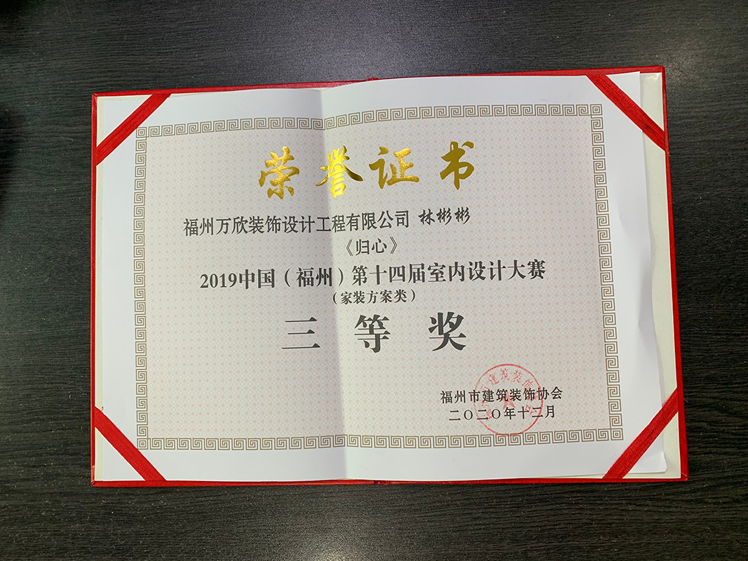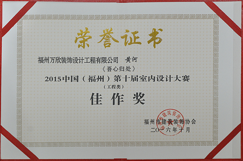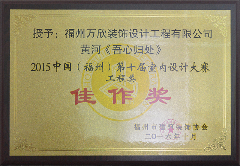 - >萬欣裝飾作品《吾心歸處》被評為中國(福州)第十屆室內(nèi)設(shè)計大賽(工程類)佳作獎