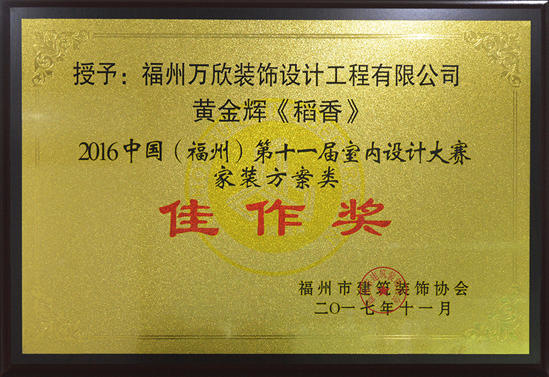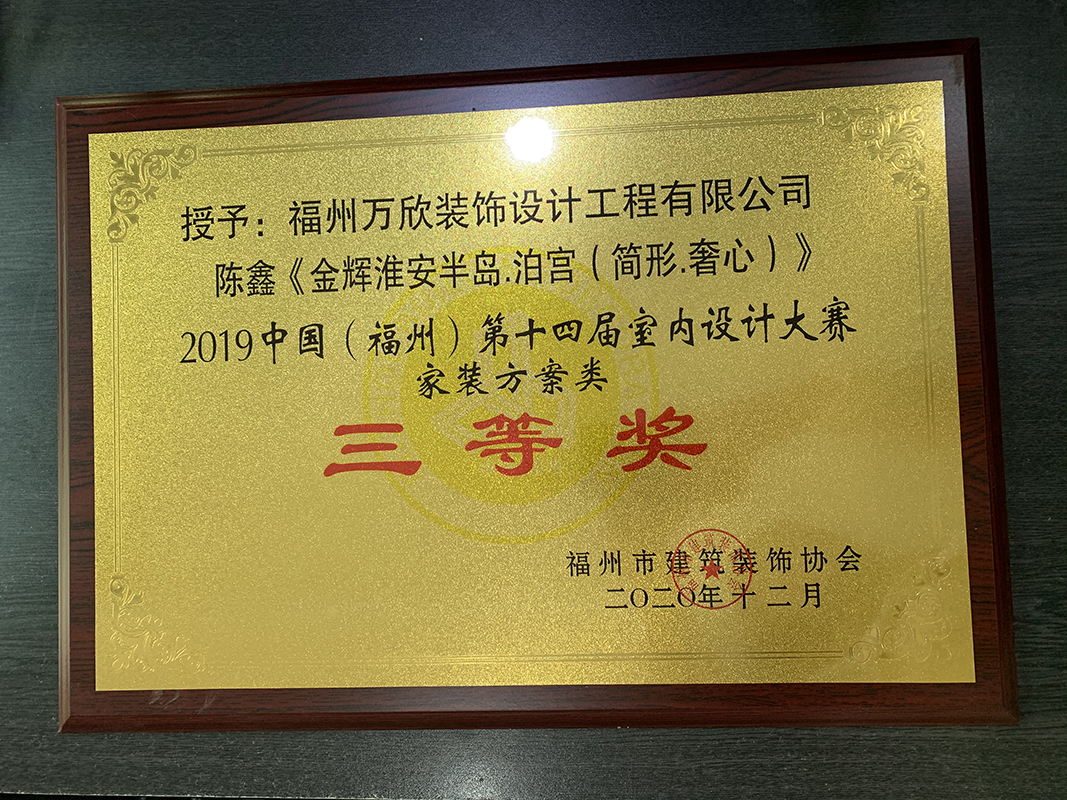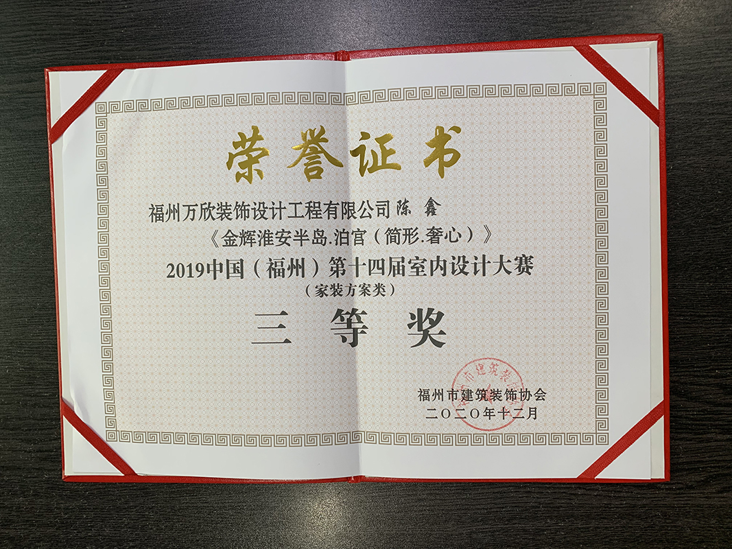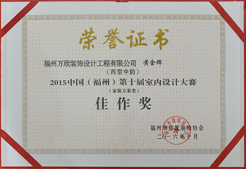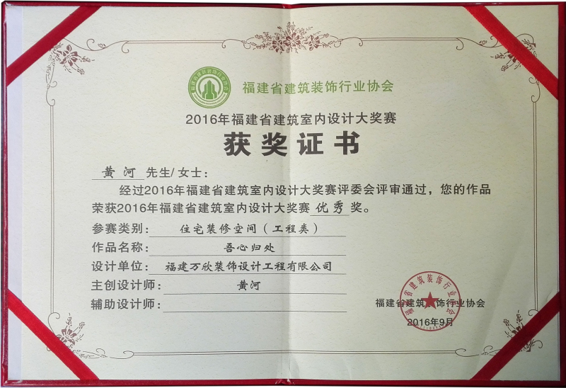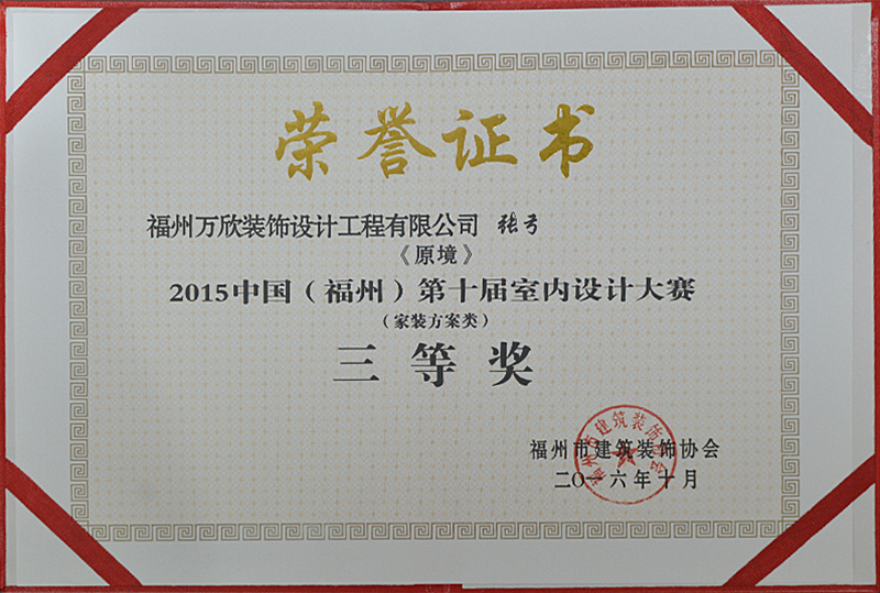 - >萬欣裝飾作品《吾心歸處》被評為中國(福州)第十屆室內(nèi)設(shè)計大賽(工程類)佳作獎