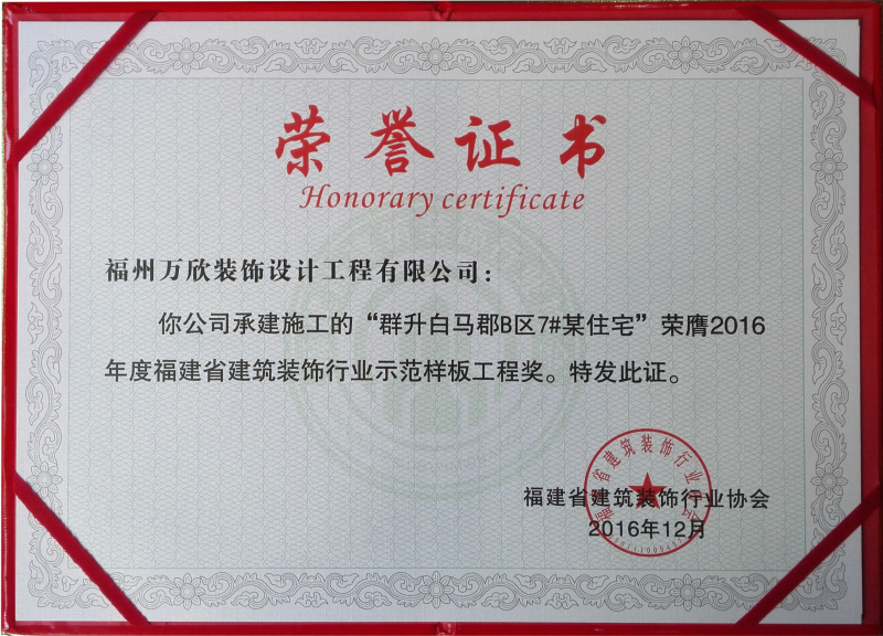 - >“群升白馬郡B區(qū)7#某住宅”榮膺2016年度福建省建筑裝飾行業(yè)示范樣板工程獎