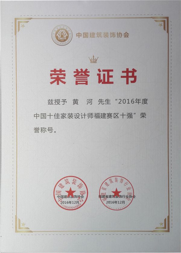 - >黃河榮獲“2016年度中國十佳家裝設(shè)計師福建賽區(qū)十強(qiáng)”稱號