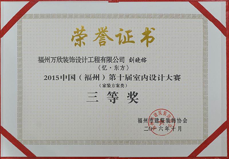 - >萬欣裝飾作品《憶·東方》被評為中國(福州)第十屆室內(nèi)設(shè)計大賽(家裝方案類)三等獎