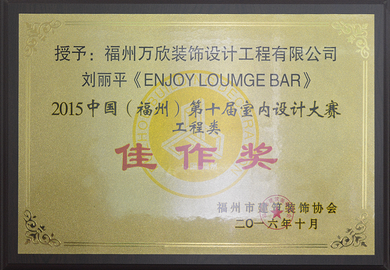 - >萬欣裝飾作品《ENJOY LOUMGE BAR》被評為中國(福州)第十屆室內(nèi)設(shè)計大賽(工程類)佳作獎
