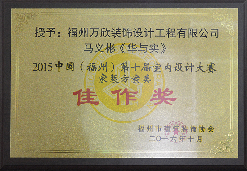 - >萬欣裝飾作品《華與實》被評為中國(福州)第十屆室內(nèi)設(shè)計大賽(家裝方案類)佳作獎