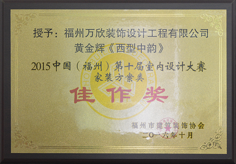 - >萬欣裝飾作品《西型中韻》被評為中國(福州)第十屆室內(nèi)設(shè)計大賽(家裝方案類)佳作獎
