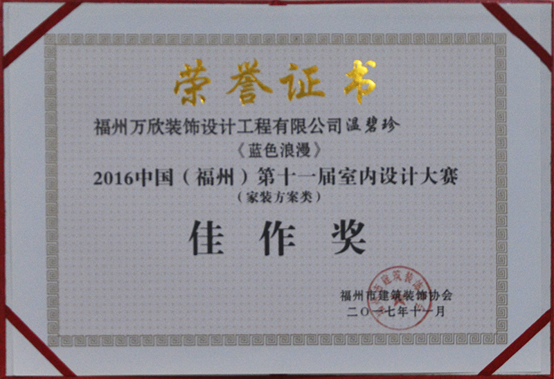- >萬欣裝飾作品《悅、微涼》被評為中國(福州)第九屆室內(nèi)設(shè)計大賽(家裝方案類)佳作獎