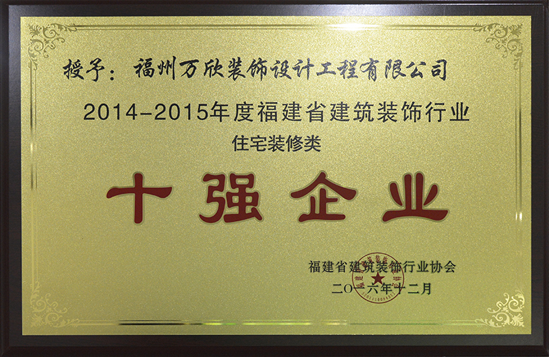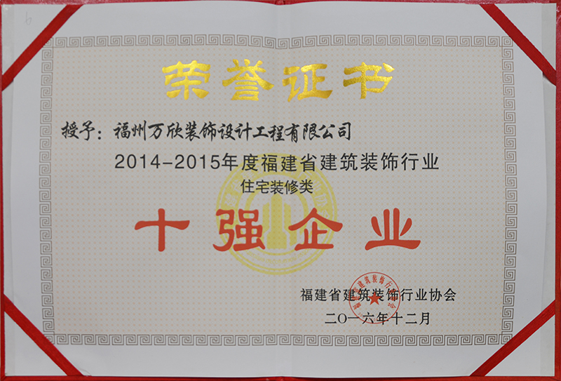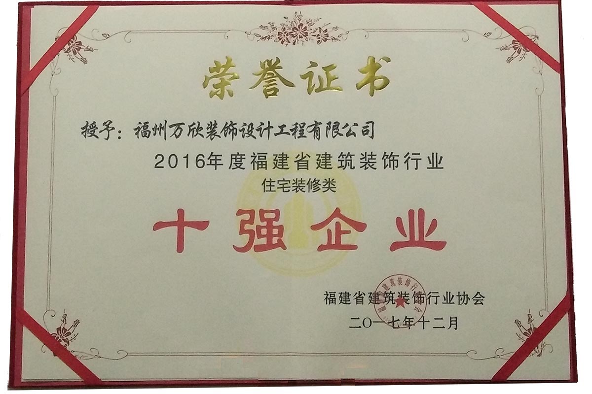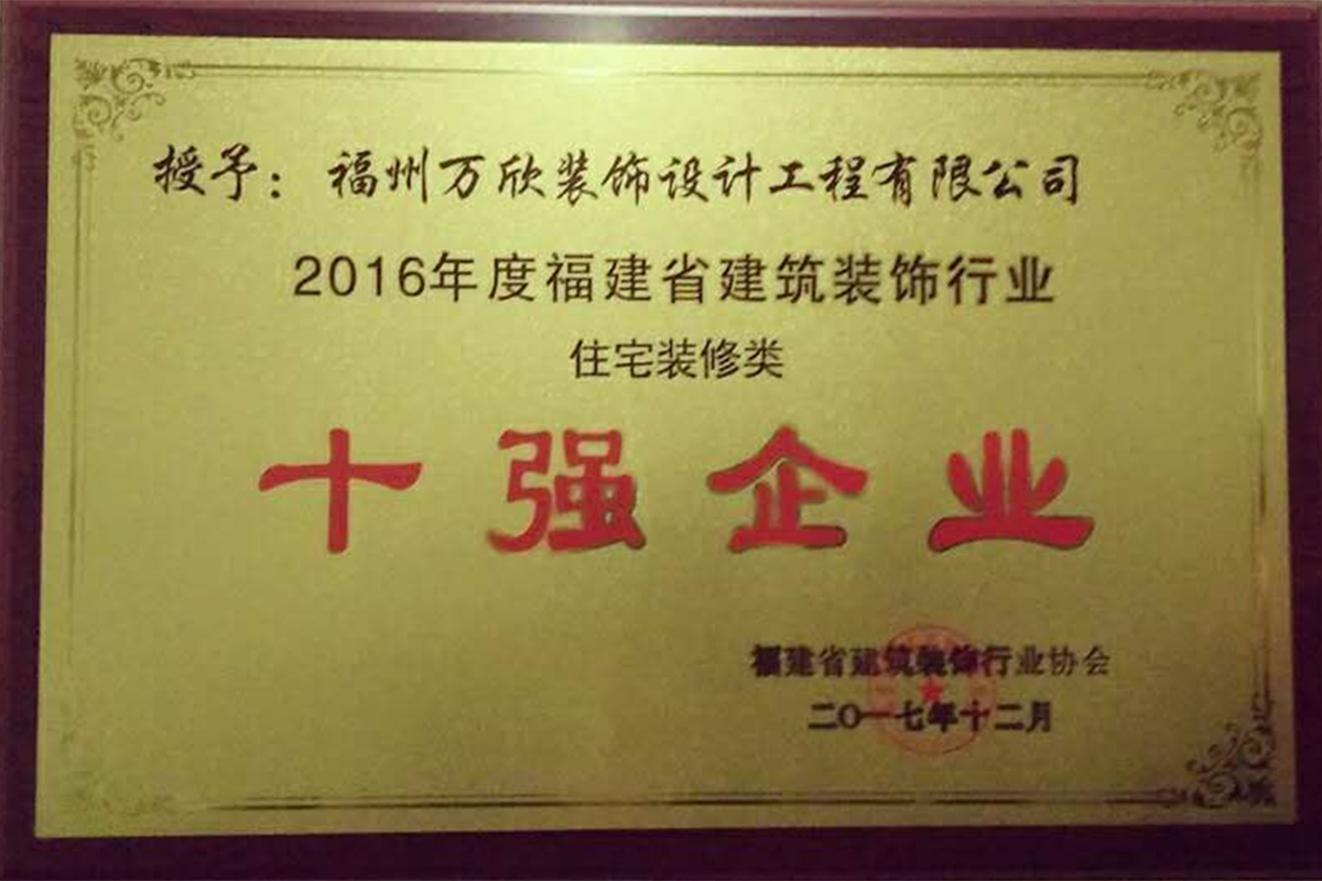 - >萬欣裝飾榮獲2016年度福建省建筑裝飾行業(yè)住宅類裝修十強(qiáng)企業(yè)