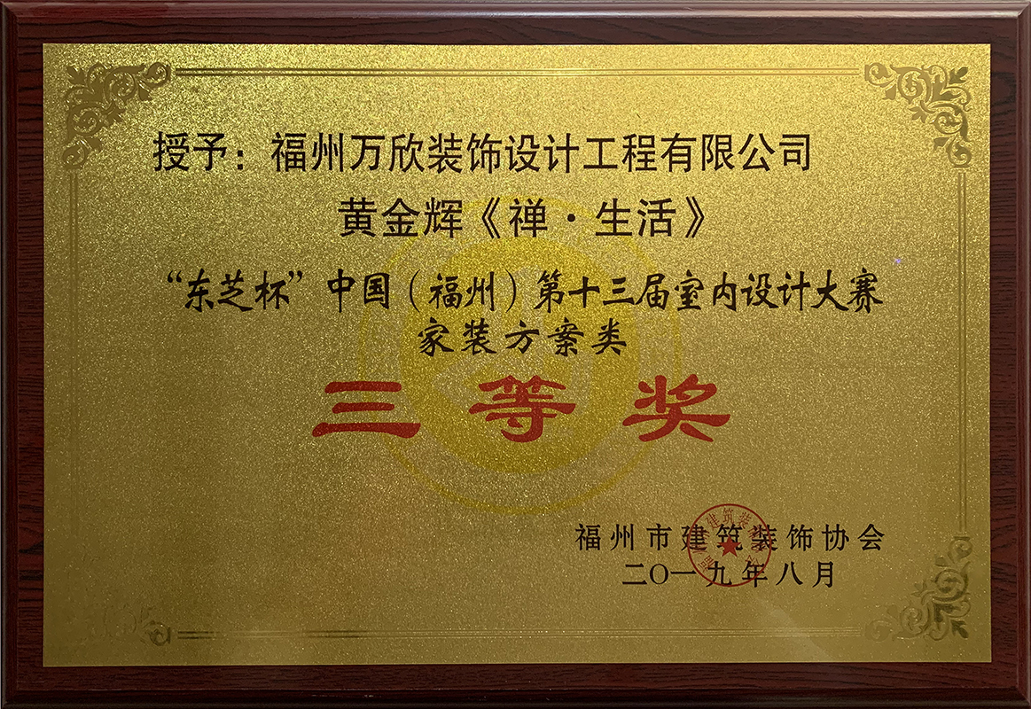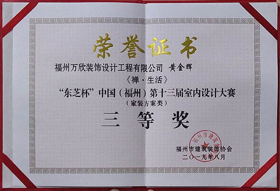 - >萬欣裝飾作品《禪 · 生活》被評為中國(福州)第十三屆室內(nèi)設(shè)計大賽(家裝方案類)三等獎