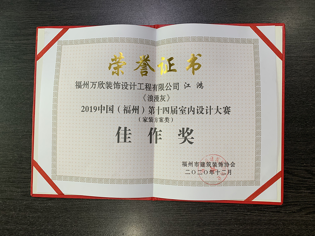 - >萬欣裝飾作品《浪漫灰》被評為中國(福州)第十四屆室內(nèi)設(shè)計大賽(家裝方案類)佳作獎