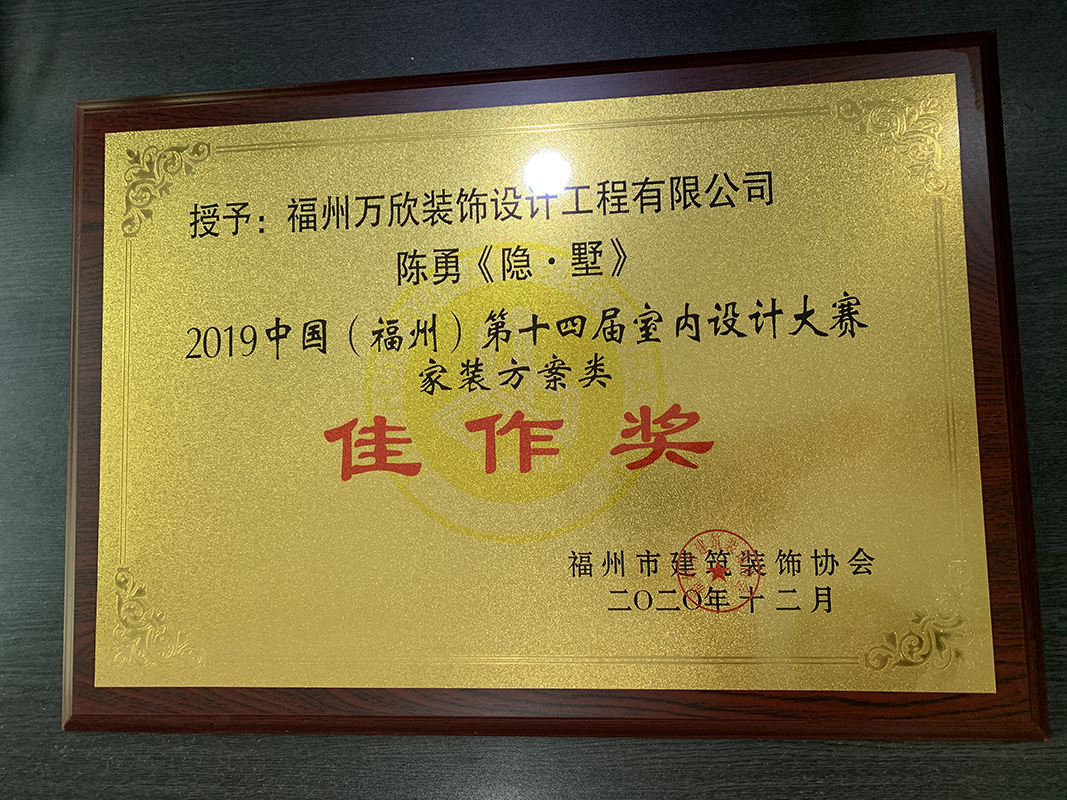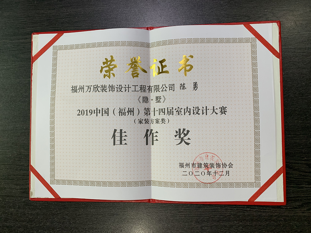 - >萬欣裝飾作品《隱.墅》被評為中國(福州)第十四屆室內(nèi)設(shè)計大賽(家裝方案類)佳作獎